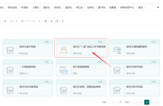 3.在办事大厅下方选择“研究生“三助”岗位工作考核申请”。