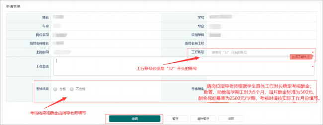 (4)各单位的指导老师在对该单位的助管、助教考核时需要填写金额。(助管每学期工时最长为5个月,每月酬金标准为500元/月,酬金标准最高为2500元/学期,考核时需按实际工时月份填写;助教每学期工时最长为5个月,博士助教每月酬金标准最高为1000元/月,酬金标准最高为5000元/学期,硕士助教每月酬金标准最高为500元/月,酬金标准最高为2500元/学期,考核时需按实际工时月份填写。)