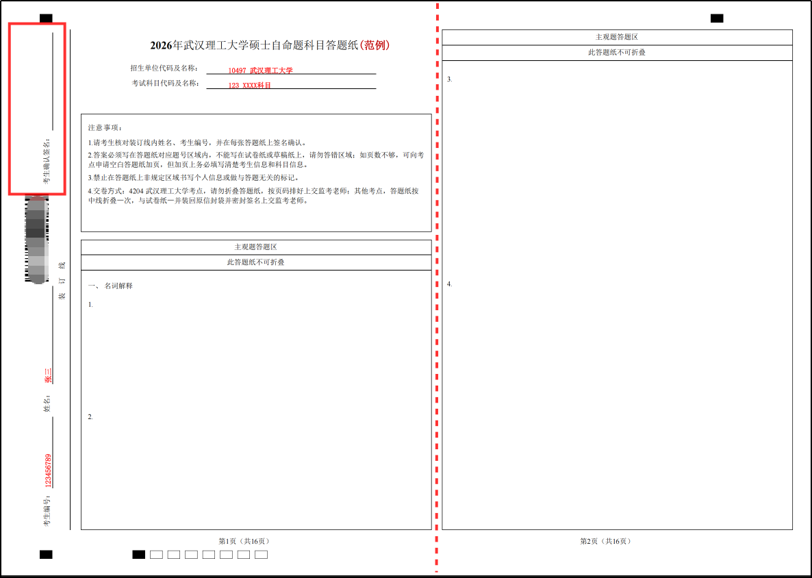 考生信封拆封后,首先核对信封上的个人信息与答题卡上个人信息是否正确,如信息无误请在所有答题卡考生确认签名处(范例左上角红色方框处)签名确认;如信息有误请联系报考点使用通用答题卡,填写正确的个人信息。