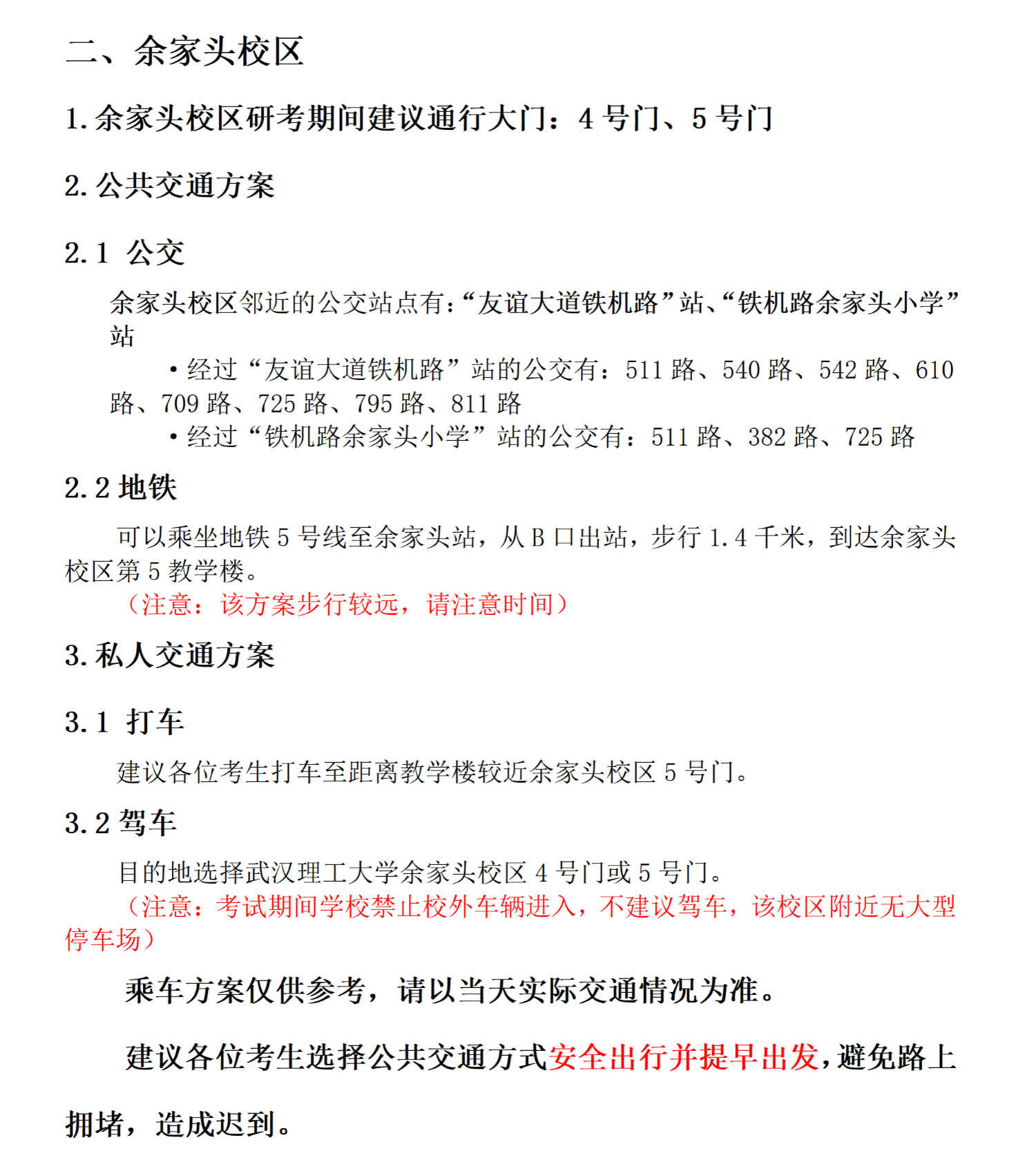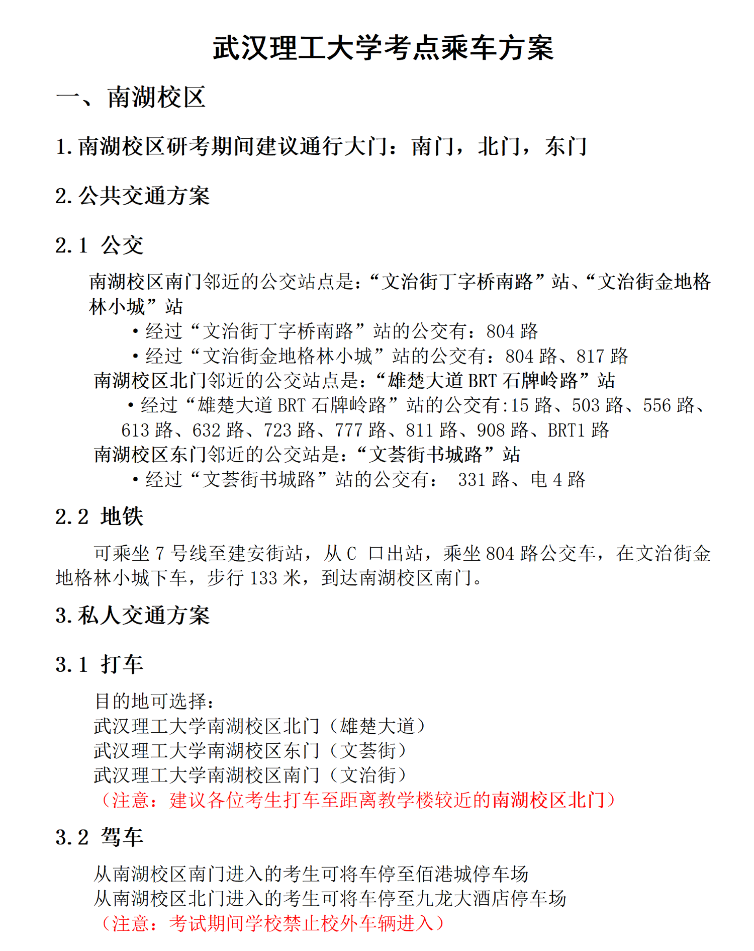 3.考生可查看《武汉理工大学考点乘车停车方案》选择合适的交通工具。需要特别注意的是:为保障考试安全,考试期间禁止校外车辆入校。