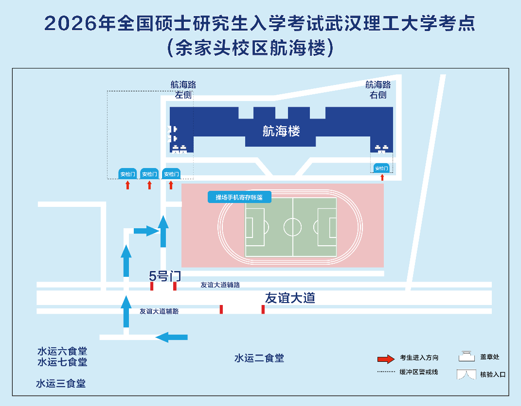 2.到余家头校区航海楼考试的考生可从5号门(友谊大道路南)和4号门(友谊大道路北)进入,5号门到考场距离:步行225米,约3分钟。4号门到考场距离:步行386米(通过校内天桥),约6分钟。